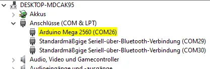 Wenn du den Mikrocontroller mit einem Microsoft Windows-PC verbindest, dann wird dieser als „Arduino Mega 2560“ erkannt.