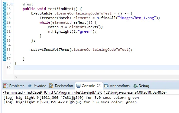 Wenn der Bildausschnitt nicht gefunden wurde, so wird eine FindFailedException geworfen und der Testfall abgebrochen. In meinem Fall teste ich durch „assertDoesNotThrow“ das die Exception nicht geworfen wurde.