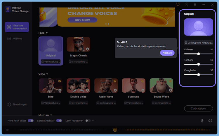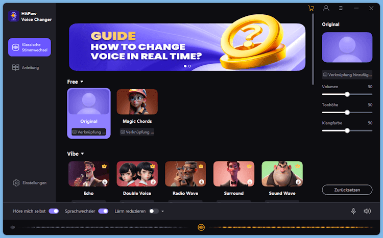Echo- und Rauschunterdrückung: Der Voice Changer bietet die Funktion, störende Hintergrundgeräusche wie Echo und Rauschen zu entfernen, um eine klarere und professionellere Klangqualität zu gewährleisten.