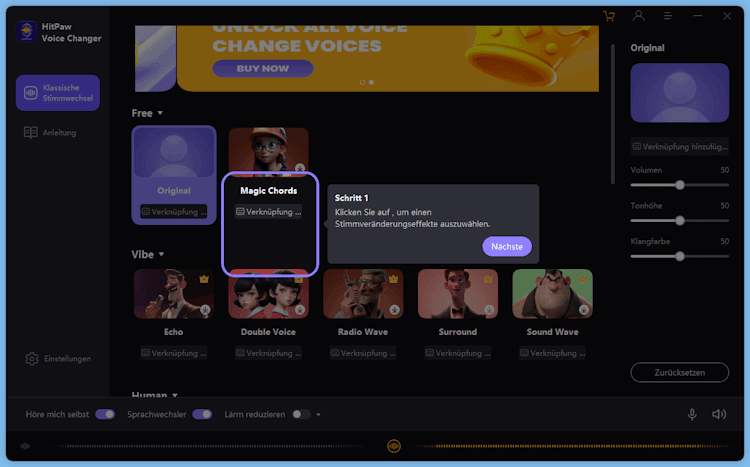 Verschiedene Stimmänderungseffekte: Der Voice Changer bietet eine Vielzahl von Stimmänderungseffekten, die es den Benutzern ermöglichen, ihre Stimmen auf unterschiedliche Weisen anzupassen.