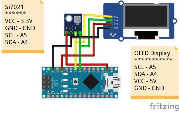 Der Temperatursensor Si7021 verfügt über eine I2C Schnittstelle und somit ergibt sich der Anschluss über die analogen Pins A4 (für SDA) und A5 (für SCL).