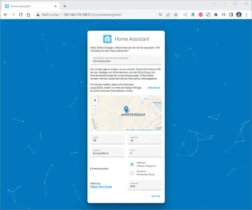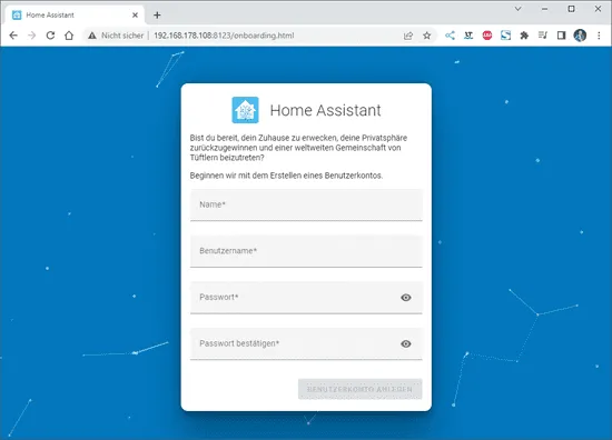 Wenn wir nun im Browser die IP-Adresse des Raspberry Pi gefolgt vom Port 8123 eingeben, dann sollten wir das Fenster für die Einrichtung eines Benutzers für Home Assistant sehen.