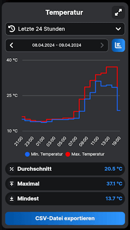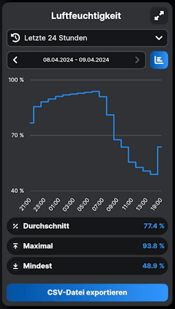 Über die App kannst du die Daten für die Temperatur und die relative Luftfeuchtigkeit in einem Diagramm für einen frei wählbaren Zeitraum anzeigen und auch als CSV Datei exportieren.