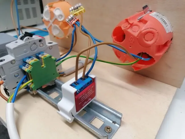 Hier habe ich eine kleine Hutschiene sowie zwei Unterputzdosen verbaut in welche ich wahlweise einen Schalter und eine Steckdose verbauen kann. Zusätzlich noch einen Verbraucher in Form einer Lampe.