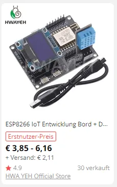 Und natürlich benötigst du auch die ESP8266 Wetterstation mit DHT11 Sensor. Diese kannst du zum Beispiel über aliexpress.com für 6,59 € inkl. Versandkosten erstehen.