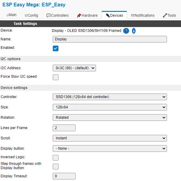 Das verbaute OLED Display wird als „OLED SSD1306/SH1106 Framed“ eingerichtet. ACHTUNG es gibt auch einen Eintrag nur „Display – OLED SSD1306“ welcher etwas weniger Möglichenkeit zur Einstellung bietet.