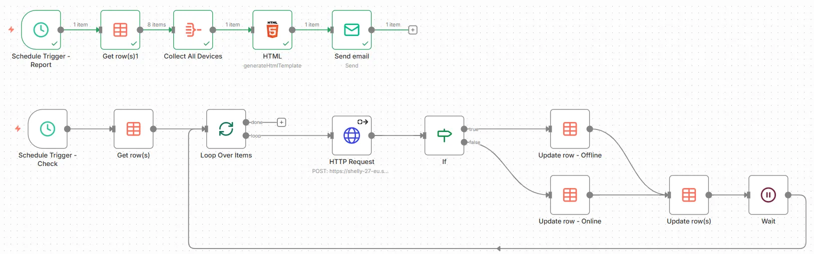 Das Prinzip ist bewusst einfach: In einem festen Intervall wird geprüft, ob ein Gerät erreichbar ist. Dabei werden die Ergebnisse direkt ausgewertet und als Kennzahlen (Online, Offline, Verfügbarkeit) gespeichert. Ein separater Workflow erzeugt anschließend daraus einen übersichtlichen Report und verschickt ihn per E-Mail.