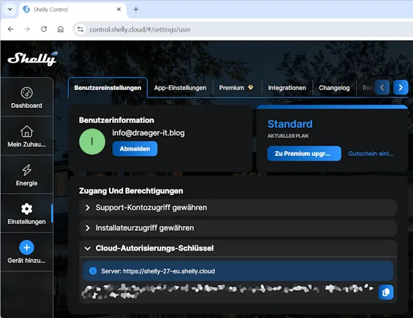 Für den in diesem Beitrag gezeigten Workflow nutze ich den Cloud-Zugriff von Shelly. Dafür werden zwei Informationen benötigt: die Server-URL der Shelly-Cloud sowie ein Auth-Key für den API-Zugriff.