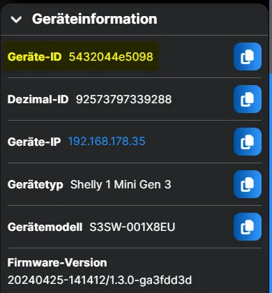 Der Auth-Key dient ausschließlich für den Zugriff auf die Shelly-Cloud und nicht für den direkten lokalen Zugriff auf das Gerät. Über diesen Schlüssel kann anschließend mit einem zusätzlichen Parameter die jeweilige Geräte-ID angegeben werden. Erst durch diese Geräte-ID wird eindeutig festgelegt, welches Shelly-Gerät angesprochen wird.