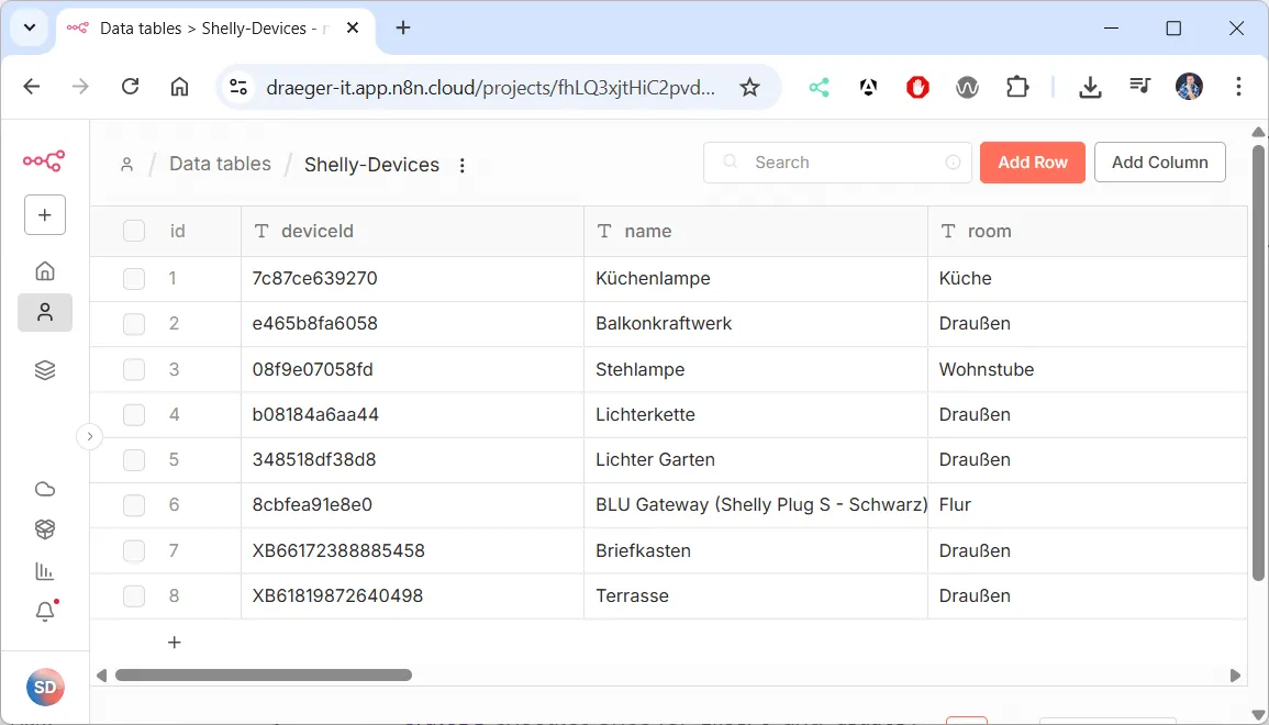 Die Daten für das Monitoring speichere ich direkt in einer Datatable innerhalb von n8n. Für dieses Setup ist das vollkommen ausreichend und hält den gesamten Workflow übersichtlich und leicht wartbar.