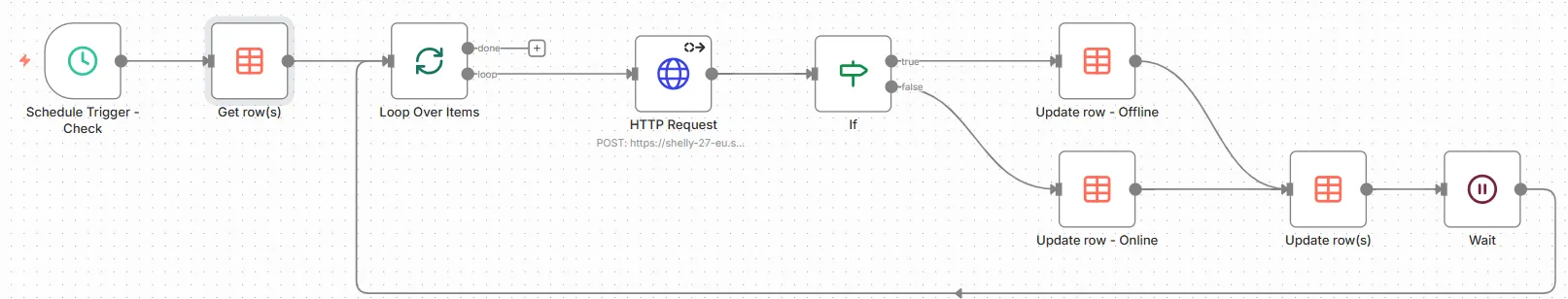 Nach der Statusauswertung werden die berechneten Werte für Online, Offline und Verfügbarkeit aktualisiert. Um die Shelly-Cloud nicht mit zu vielen Anfragen zu belasten, wartet der Workflow nach jedem Durchlauf kurz zwei Sekunden, bevor das nächste Gerät geprüft wird.