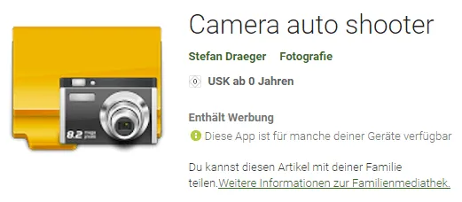 Mit der Android App „Camera auto shooter“ bin ich im Google Play Store vertreten und habe dort auch schon einige positive Rückmeldungen erhalten.