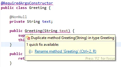 Den Konstruktor können wir mit der Annotation „@RequiredArgsConstructor“ an der Klasse sowie der Annotation „@NonNull“ an der Membervariable „text“ ersetzen. Dieses wird uns auch angezeigt das dieser nun doppelt vorhanden ist.