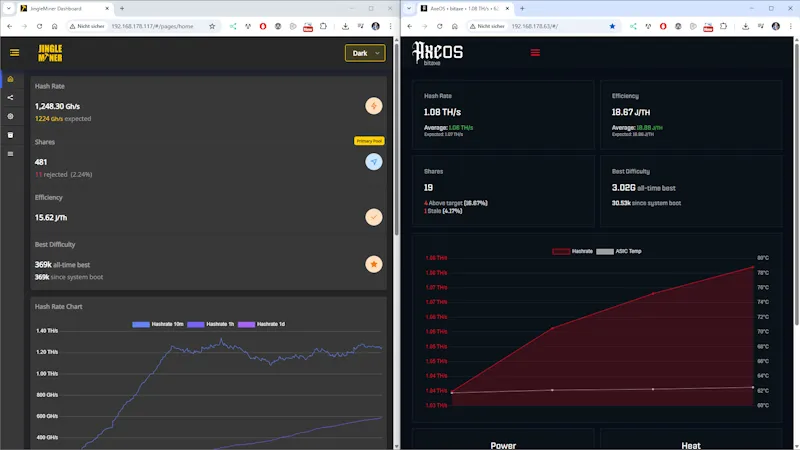 Der JingleMiner BTC Solo Lite 1.2T und der Bitaxe Gamma 601 bewegen sich beide im Bereich um die 1 TH/s und eignen sich damit als kompakte Solo-Miner für Enthusiasten. Trotz ähnlicher Leistungswerte unterscheiden sie sich bei Ausstattung und Ausrichtung: