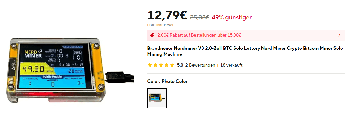 Der Jingleminer liegt preislich aktuell bei 49,90 $ zzgl. Versand und ggf. Zoll. Damit ist er deutlich teurer als klassische NerdMiner, die es z. B. bei Aliexpress bereits ab 12,79 € gibt.