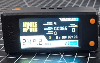 Der Jingleminer sticht im Vergleich zu klassischen NerdMiner-Setups deutlich heraus. Während viele bekannte NerdMiner auf ESP32-S3 Basis eine Hashrate von etwa 74–77 kH/s erreichen, schafft der Jingleminer in der Praxis stabile 250 kH/s – also mehr als das Dreifache.