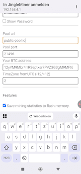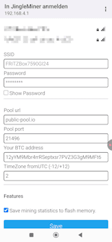 Dort lassen sich – wie gewohnt – die Zugangsdaten zum lokalen WiFi-Netzwerk sowie die eigene Bitcoin-Adresse eingeben. Nach dem Speichern startet der Miner neu und beginnt automatisch mit dem Solo-Mining.