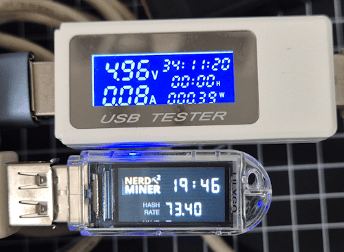 - Klassischer NerdMiner: ca. 74 kH/s bei 0,4 Watt