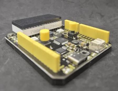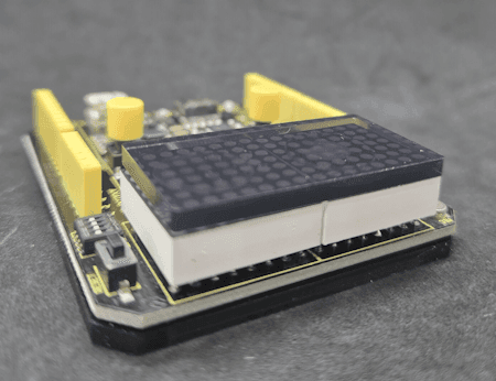 Der Mikrocontroller bringt dazu zwei Taster, die 8×16 LED Matrix sowie den Piezo Buzzer, was dafür optimal ist. (Da alles am Mikrocontroller fest verbaut ist, entfällt hier ein Aufbau der Schaltung, was das ganze nochmal deutlich vereinfacht.)