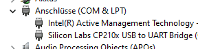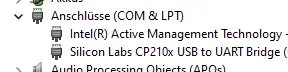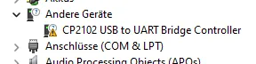 Bevor wir mit der Programmierung beginnen können, müssen wir zunächst (soweit noch nicht geschehen) den passenden USB-SERIAL Treiber installieren. Auf dem Board ist ein CP2102 Chip verbaut, in meinem Fall ist dieser nicht installiert (erkennbar am gelben Dreieck im Icon) und ich muss diesen manuell nachinstallieren.