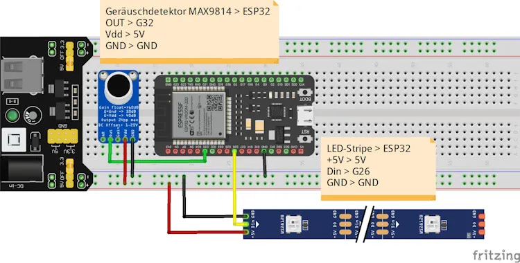 Anschluss des MAX9814 an den ESP32 mit LED-Stripe