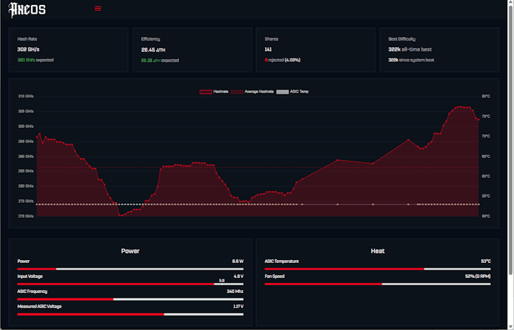 AxeOS bietet darüber hinaus eine intuitive Weboberfläche, über die du Statuswerte, Netzwerkverbindung und Mining-Aktivität bequem im Browser einsehen kannst.