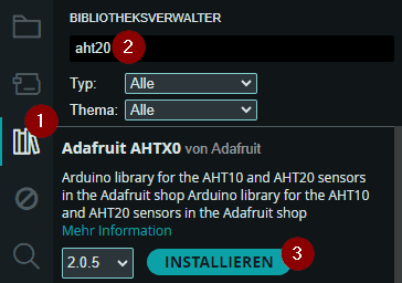 Bevor wir mit der Programmierung beginnen, installieren wir die Bibliotheken für die beiden Sensoren AHT20 & BMP280. Dazu öffnen wir den Bibliotheksverwalter (1) und suchen zunächst nach „aht20“ (2) es wird dir nun eine lange Liste von kompatiblen Bibliotheken aufgelistet. Aus dieser Liste wähle ich „Adafruit AHTX0 von Adafruit“ und klicke dort INSTALLIEREN (3). Diese Bibliothek hat jedoch einige Abhängigkeiten, welche zusätzlich installiert werden müssen. Daher klicken wir im neuen Dialog auf „ALLE INSTALLIEREN“ (4).