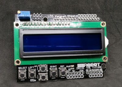Das Shield verfügt über ein 2×16 Zeichen LCD-Display und sechs Tasten, welche mit SELECT, LEFT, UP, DOWN, RIGHT und RST (Reset) beschriftet sind. Zusätzlich hast du ein Drehpotentiometer zum Regulieren der Hintergrundbeleuchtung.
