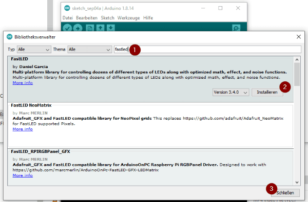 Dazu wird im Bibliotheksverwalter zunächst nach „fastled“ (1) gesucht und die Schaltfläche „Installieren“ (2) geklickt. Wenn die Bibliothek installiert ist, dann kann der Dialog über die Schaltfläche „Schließen“ (3) geschlossen werden.