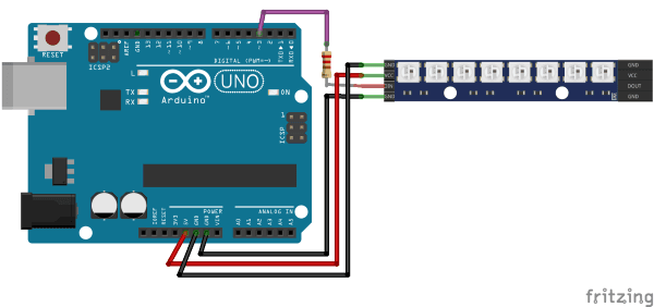 Der mir vorliegende LED Stipe mit 8 LEDs vom Typ WS2812B hat die Pins GND, VCC, DIN und GND.