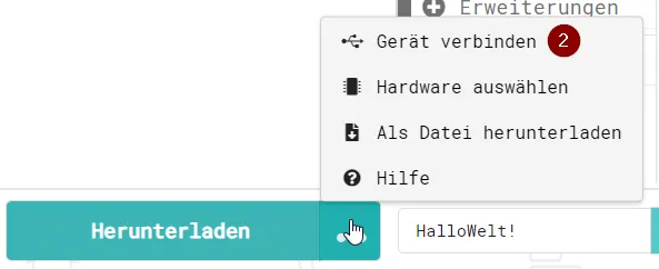 Nun ist dein Mikrocontroller via WebUSB verbunden und du brauchst lediglich die Schaltfläche „Herunterladen“ klicken und dein Programm wird direkt auf den Mikrocontroller überspielt.
