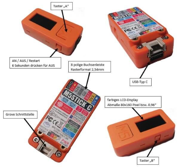 Auf der Rückseite des M5StickC findest du eine kleine Infografik mit den wichtigsten Pinbelegungen.