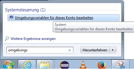 Unter Microsoft Windows öffnen Sie dazu das Startmenü und geben „umgebungs“ ein, diese kurze Zeichenkette sollte ausreichen, damit Ihnen der Menüpunkt „Umgebungsvariablen für dieses Konto bearbeiten“ angezeigt wird.