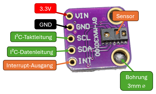 Hinweis: Der MAX30100 ist ein Sensor für den Hobby- und DIY-Bereich und nicht für den medizinischen Einsatz geeignet. Die gemessenen Werte können Anhaltspunkte liefern, ersetzen jedoch keinesfalls eine ärztliche Untersuchung oder professionelle Überwachung. Medizinisch zugelassene Geräte aus der Apotheke oder dem Sanitätshaus unterliegen strengen Normen und regelmäßigen technischen Prüfungen – etwas, das wir im Hobbybereich nicht leisten können. Nutze den Sensor daher ausschließlich für experimentelle oder edukative Zwecke.