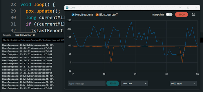 Auslesen der Werte für Herzfrequenz und Blutsauerstoff in der Arduino IDE