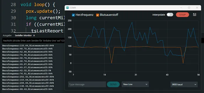 - Auslesen der Werte für Herzfrequenz und Blutsauerstoff in der Arduino IDE