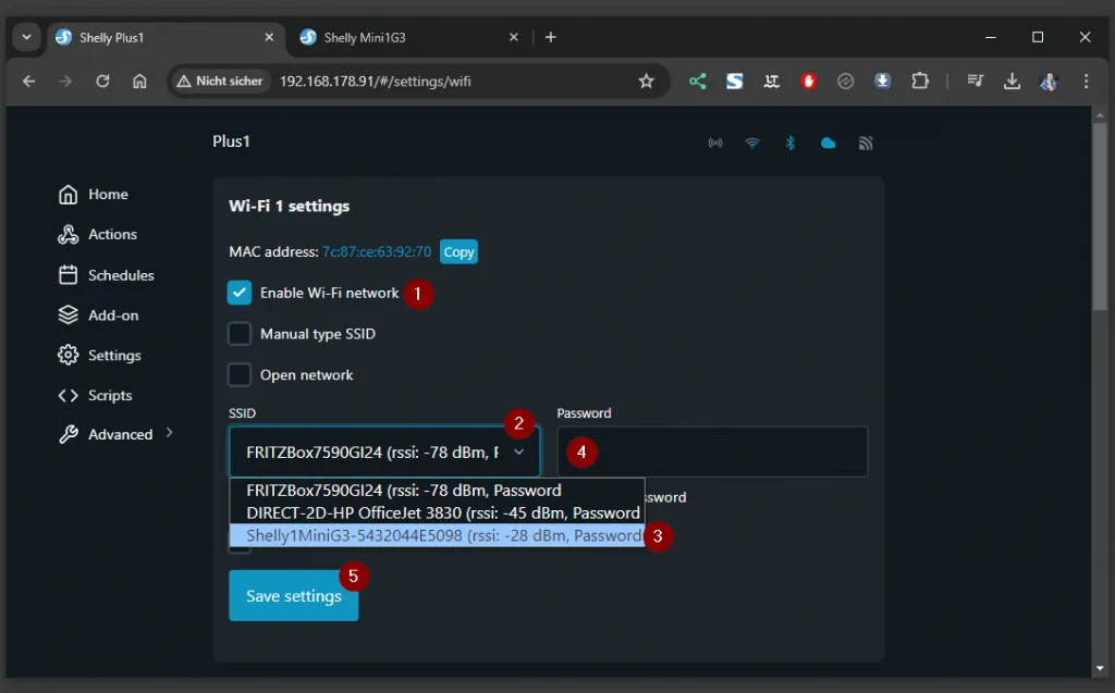 Nachdem wir jetzt den Access Point am Shelly 1 Mini Gen3 eingerichtet haben, verbinden wir den Shelly Plus 1 zu diesem.