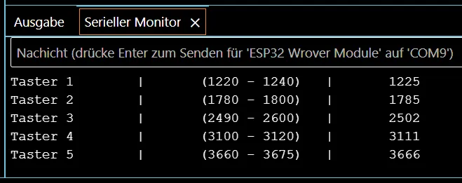 Dadurch entsteht je nach gedrücktem Taster eine andere Spannung – und somit ein anderer ADC-Wert.