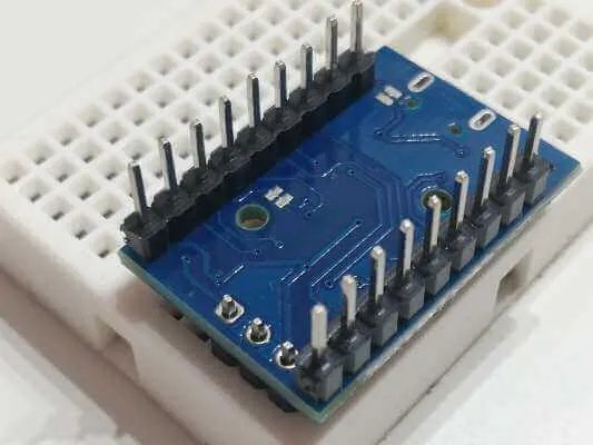 Dem Mikrocontroller lag neben der Platine auch 2x 9 Pin Stiftleisten im Rastermaß von 2,54 mm bei.