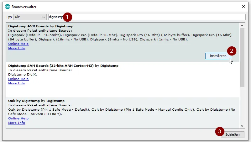 Nun muss die Adresse „http://digistump.com/package_digistump_index.json“ hinzugefügt werden und es kann dann über den Boardverwalter nach dem Begriff „digistump“ (1) gesucht werden.