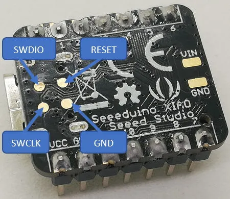 Auf der Rückseite des SAMD21 sind 6 Lötpunkte von welchen 2 mit jeweils „VIN“ für die Spannungsversorgung (ohne USB betrieb) und „GND“ beschriftet sind, die anderen 4 Lötpunkte sind nicht beschriftet.