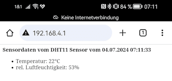 Auf der kleinen Webseite werden jetzt die Sensordaten inkl. einem Zeitstempel ausgegeben. Jedes Mal, wenn wir jetzt die Webseite aktualisieren, werden auch neue Sensordaten ausgelesen und ausgeliefert.