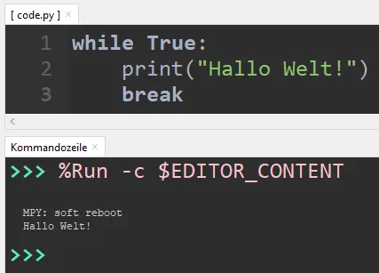 In diesem Beispiel startet die Endlosschleife, gibt den Text „Hallo Welt!“ aus und sofort danach wird diese abgebrochen.