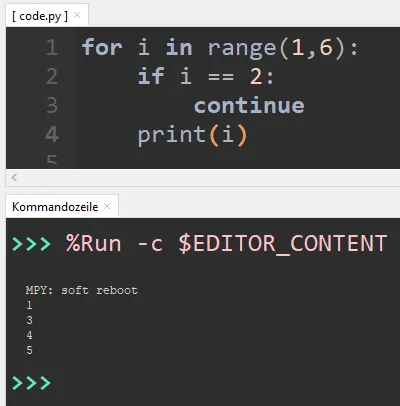 In der Ausgabe siehst du das die Zahl 2 übersprungen wurde, das liegt daran das wir im Code prüfen ob der aktuelle Index gleich 2 ist und wenn dieses so ist, soll die Ausführung an dieser Stelle abgebrochen werden.