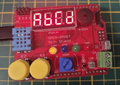 Wie man Zahlen und Zeichen auf der 4-fach 7-Segmentanzeige mit MicroPython am ESP32 anzeigen kann, zeige ich dir hier in meinem neuen Beitrag. Dafür verwende ich wieder das Rich Shield von Open Smart. Du bekommst diese Anzeige jedoch auch als einzelnen Baustein und das sogar in diversen Farben und sogar mit mehr Segmenten. Auch hier zeige ich dir wieder eine alternative Schaltung, solltest du das genannte Rich Shield nicht haben.