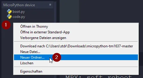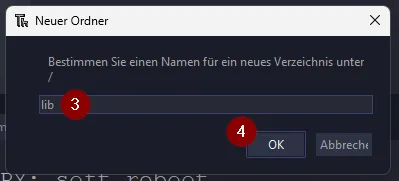 Im Bereich „MicroPython device“ klicken wir mit der rechten Maustaste auf den freien Bereich (1) und wählen aus dem Kontextmenü den Eintrag „Neuer Ordner…“ (2). Im neuen Fenster geben wir dann „lib“ ein (3) und bestätigen dieses mit der Schaltfläche „OK“ (4).
