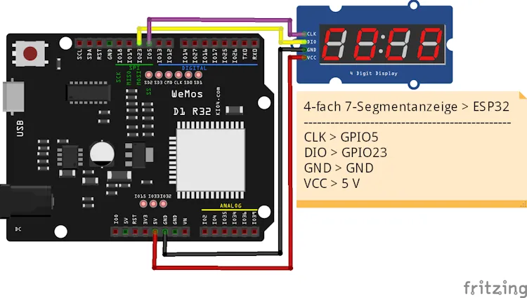 - Anschluss einer 4-fach 7-Segmentanzeige an den ESP32 D1 R32