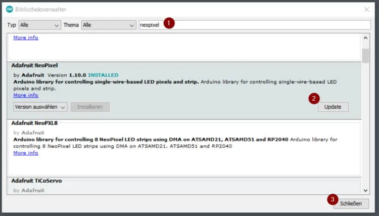 Dazu suchst du im geöffneten Bibliotheksverwalter nach „neopixel“ (1) und wählst im Eintrag „Adafruit Neopixel by Adafruit“ die Schaltfläche „Installieren“, in meinem Fall habe ich diese bereits in der Version 1.10.0 installiert und könnte auf eine höhere Version, mit der Schaltfläche „Update“ (2) aktualisieren.