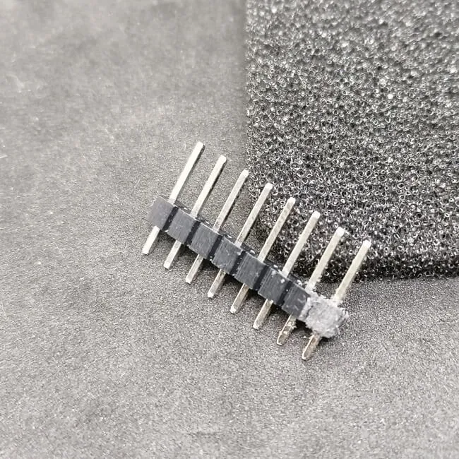 Leider ist die eine Stiftleiste etwas zu dicht am Taster verbaut bzw. die Lötaugen sind zu dicht, sodass man mit einer kleinen Schlüsselfeile die Stiftleiste anpassen muss.