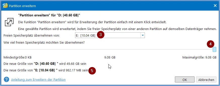 Im neuen Dialog kannst dann aus einer Auswahlliste eine Partition wählen (3) von welcher du Speicherplatz abzweigen möchtest. Über den Schieberegler (4) kannst du dann die Größe wählen. Im unteren Bereich (5) siehst du dann die neue Größe der aus dem ersten Schritt ausgewählten Partition und der Partition, von welcher wir Speicherplatz abzweigen möchten.